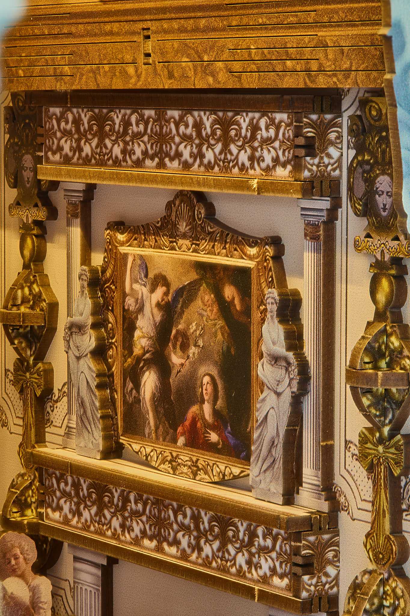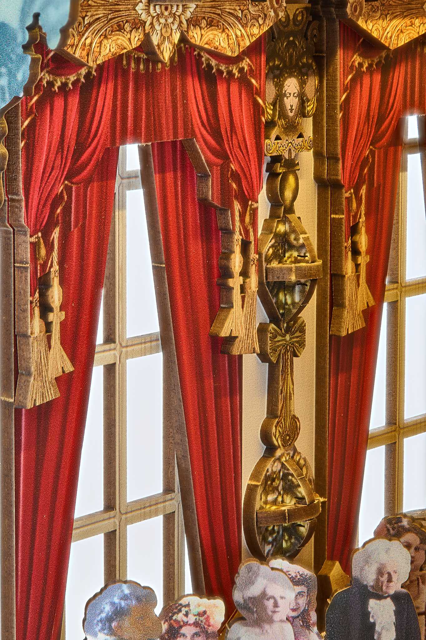 Pohled na polici. A jste uprostřed světa Bridgerton. Tento knižní kout ukazuje scény z filmu „Vévoda a já“ – jako trojrozměrnou miniaturu, kterou si můžete sami postavit. Precizní dřevěné komponenty, dotykový senzor, LED světlo. Funguje bez předchozí znalosti. Hodí se mezi vaše knihy.